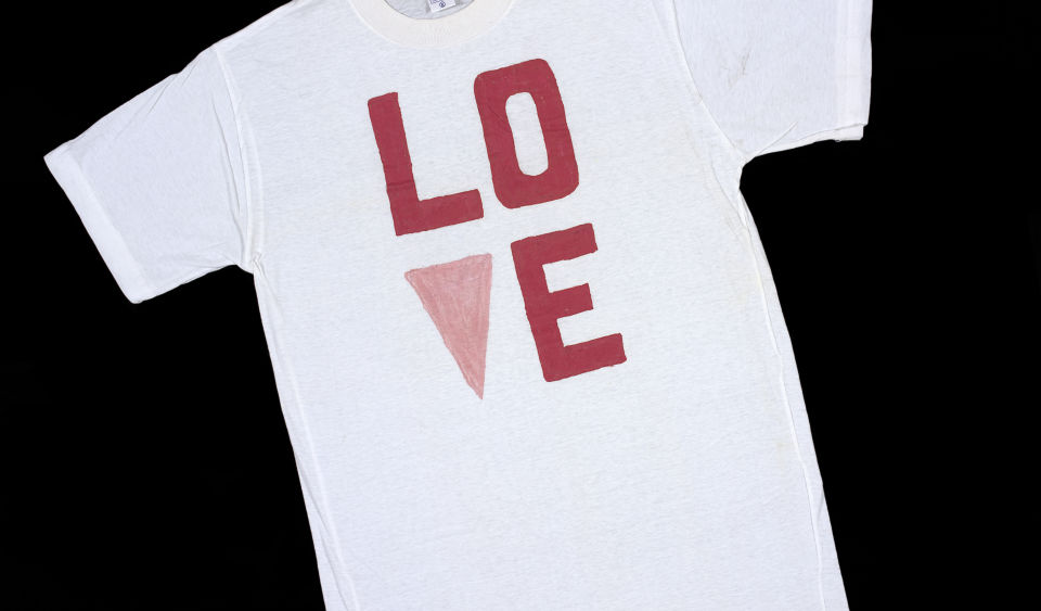 Looking through these objects in the stores, the one I find the most compelling is also the most mysterious. It’s a plain white t-shirt which has been decorated with fabric paints. “LOVE” is written across it, with a pink triangle in place of the V. The format is reminiscent of the Robert Indiania pop art print, with a stripped back, gay liberation twist.
